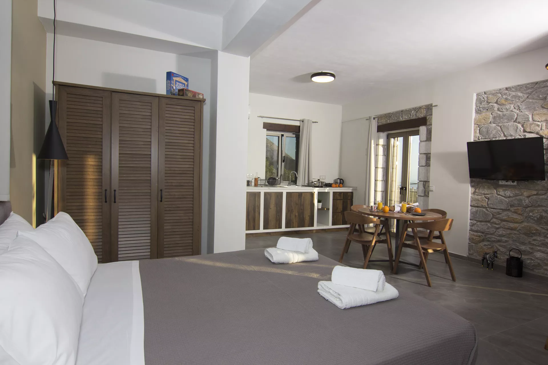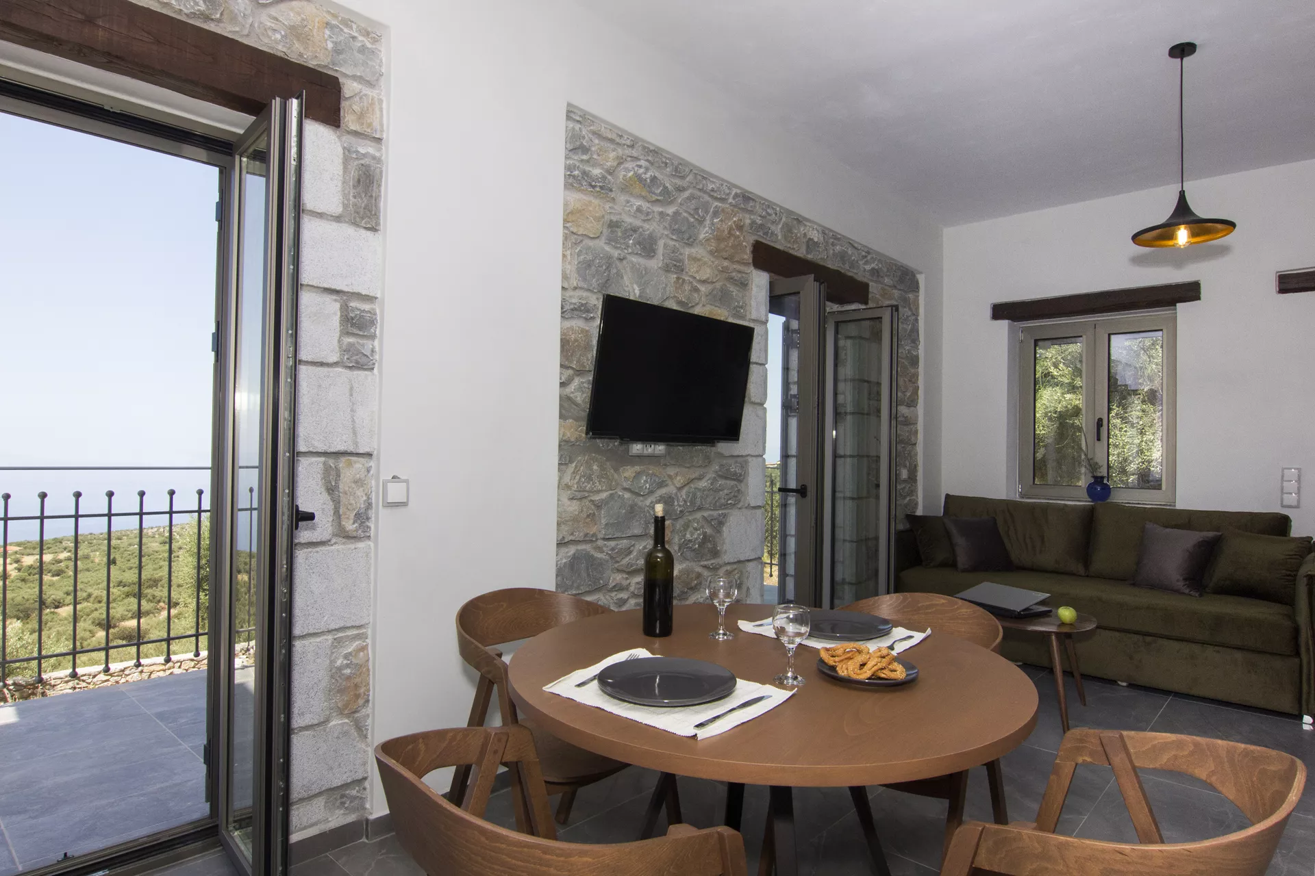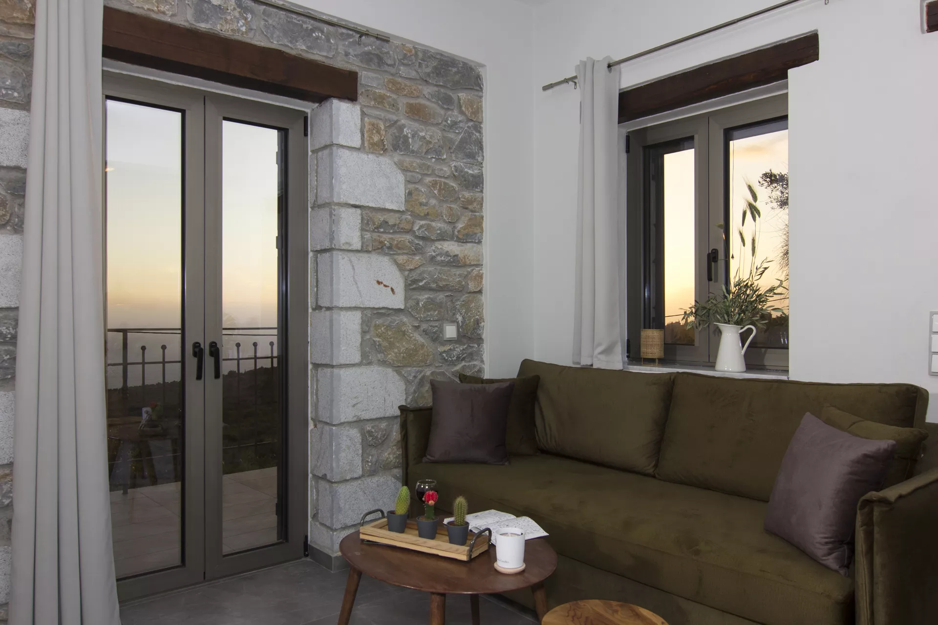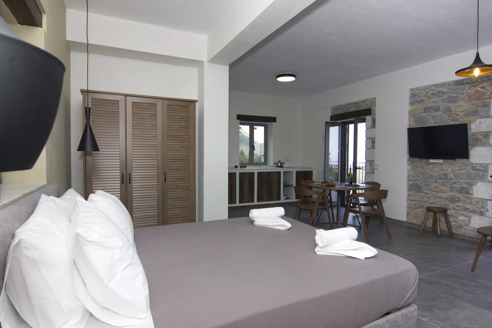 On the same level is a king-size double bed, a wardrobe, free Wi-Fi, air conditioning, a bathroom with a walk-in rain shower, hair and body care products, a terrace with a stunning view of the sea and the mountain and can accommodate from 1 up to 4 people. Relax on your private terrace and keep forever the moments when the Greek sun of Mani paints the Messinian gulf in golden hues...