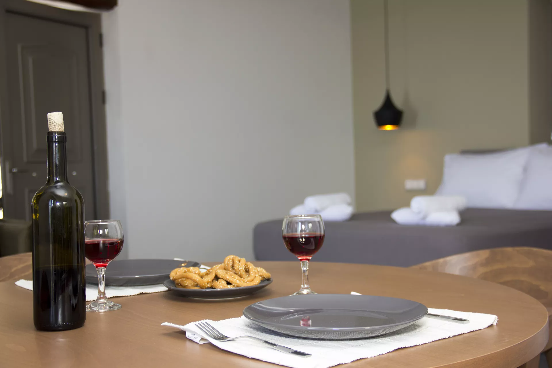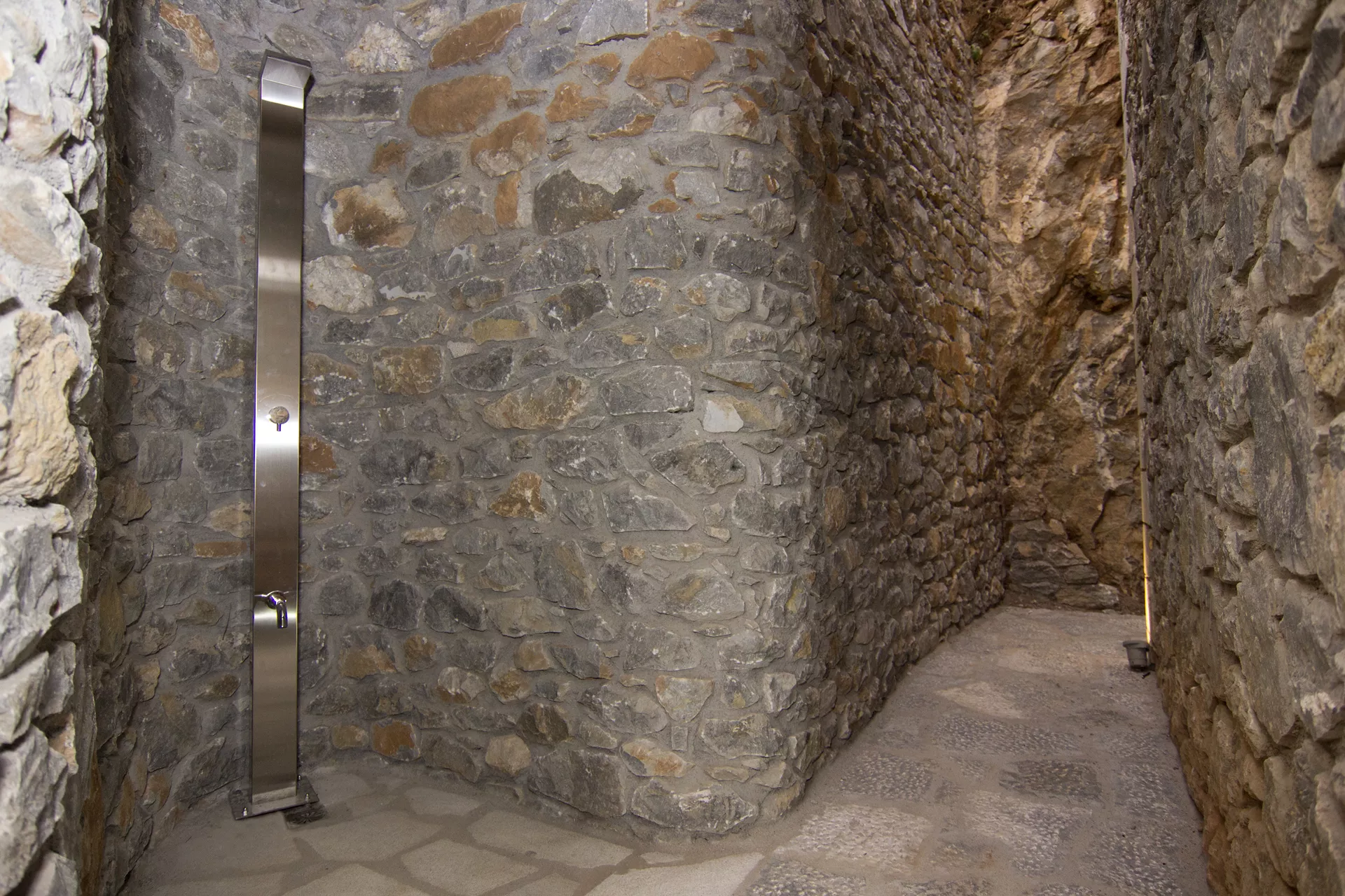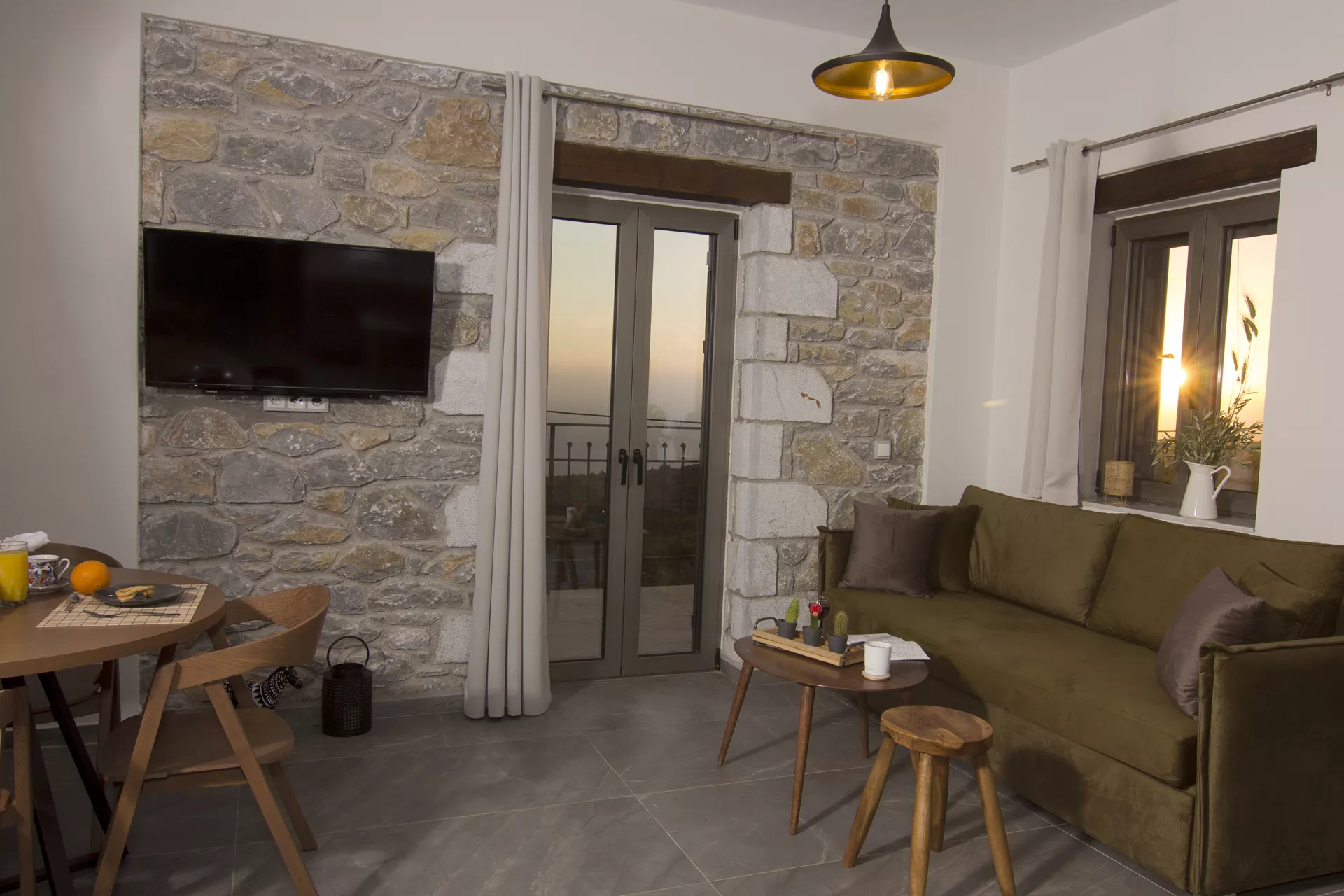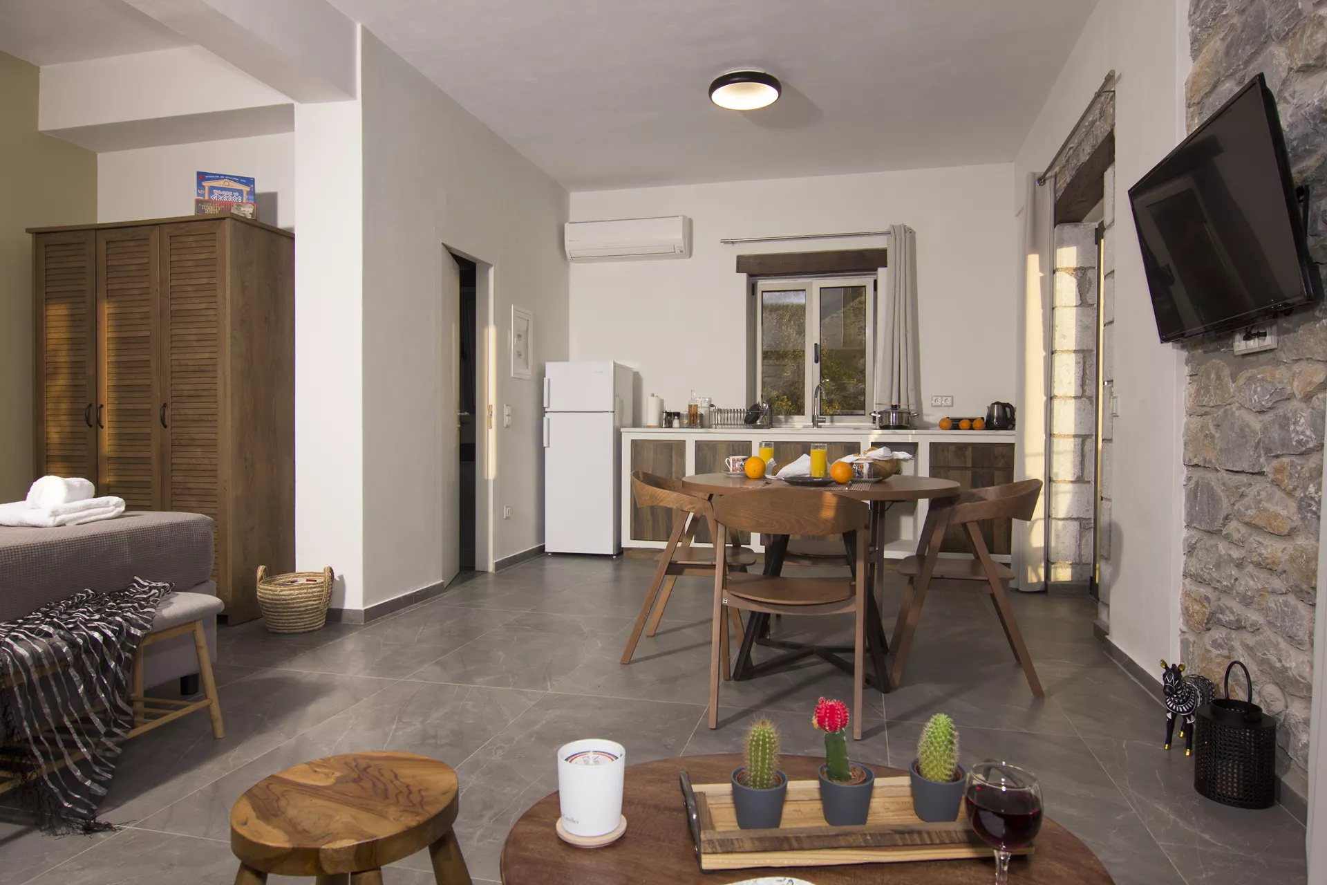 The stone house (52m²) is spacious and modestly decorated with elements and materials in complete harmony with the aesthetics of the building and the surrounding area. It has a comfortable living room with a comfortable sofa, next to the dining room and the open kitchen.